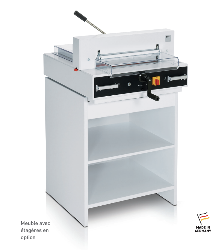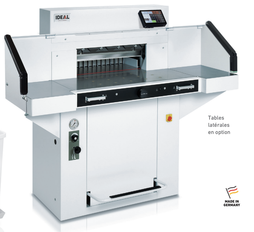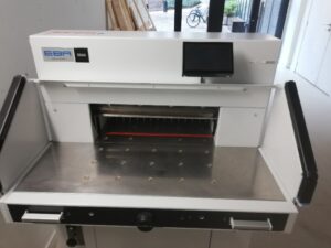 Massicot professionnel avec pression hydraulique, tables soufflantes de série à l’avant et à l’arrière et lame HSS de haute qualité.