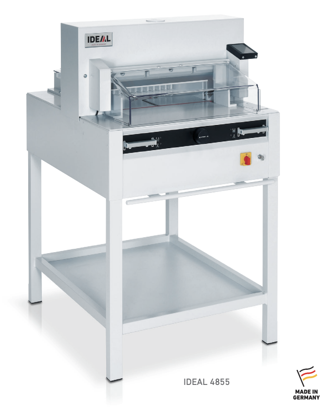 Massicot électrique avec barrage immatériel, EASY-CUT, pression automatique, écran de commande tactile pour le réglage de la butée arrière et longueur de coupe de 475 mm.